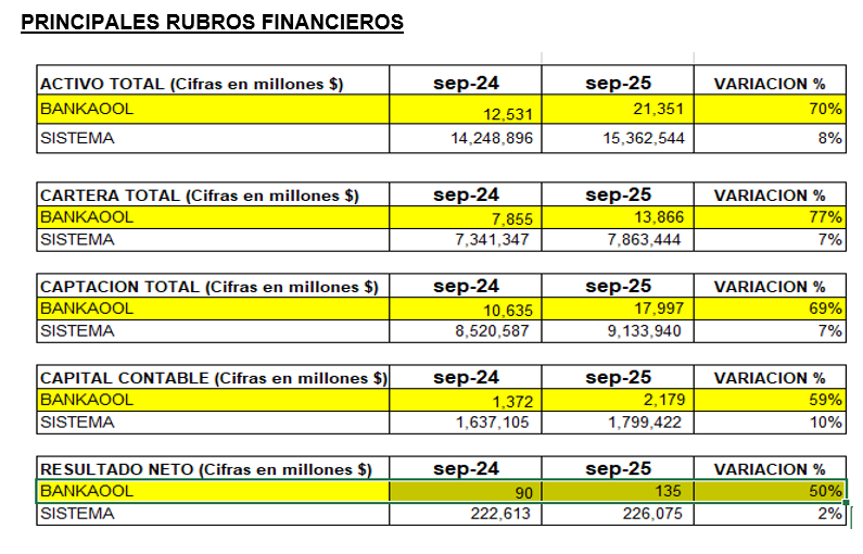 4. En cuanto a sus principales rubros financieros del Estado de Situación Financiera y el de Resultados, se observa que Activo, Cartera y su Captación aumentaron en el rango del 70%, cuando el Sistema bancario apenas llega al 8% de crecimiento en estos renglones.