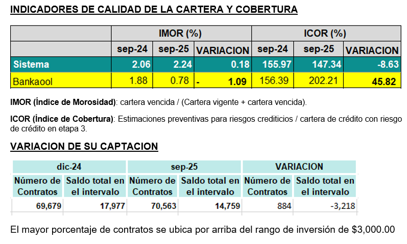 8. Respecto al Índice de Cobertura (ICOR) se incrementó, cuando el sistema bancario presenta disminución, lo que significa que se incrementaron por parte de Bankaool sus Estimaciones Preventivas de Riesgo de Crédito.