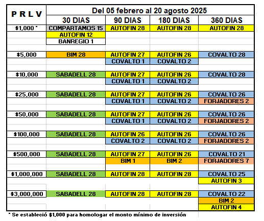 - Los plazos y rangos de inversión, los homologamos con los más utilizados por la clientela bancaria para evitar presentar una lista interminable de ellos.
