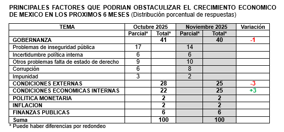 Banco de México (Banxico) recaba entre 42 grupos de análisis y consultoría económica del sector privado nacional y extranjero, una encuesta mensual sobre expectativas económicas de México, las cuales sirven para realizar pronósticos y expectativas de la situación actual y futura de la economía nacional en sus principales indicadores macroeconómicos y financieros, las respuestas las recibió entre el 14 y 26 de noviembre 2025.