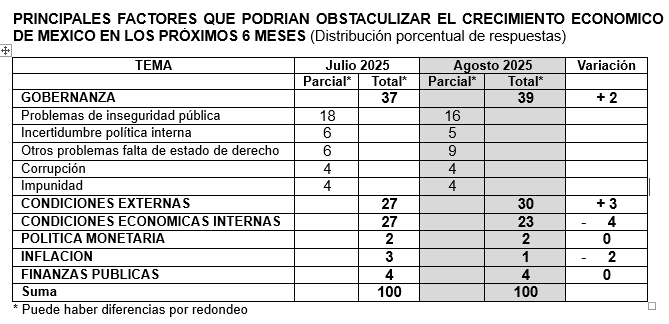 Banco de México (Banxico) recaba entre 45 grupos de análisis y consultoría económica del sector privado nacional y extranjero, una encuesta mensual sobre expectativas económicas de México, las cuales sirven para realizar pronósticos y expectativas de la situación actual y futura de la economía nacional en sus principales indicadores macroeconómicos y financieros, las respuestas las recibió entre el 18 y 28 agosto 2025.