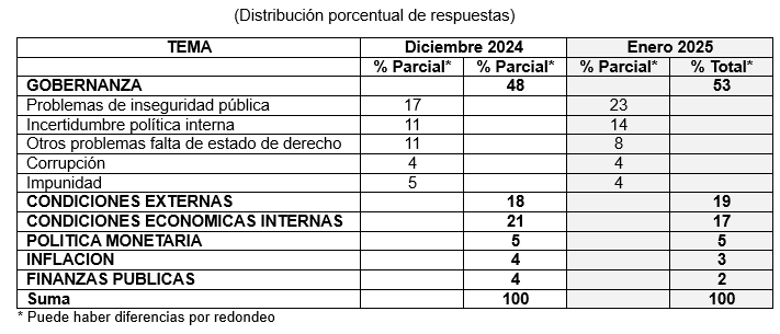 De las respuestas de los especialistas a un cuestionario respecto a los principales factores que pueden obstaculizar el crecimiento económico de México en los próximos 6 meses, 3 de ellos agrupan los mayores porcentajes de respuestas: