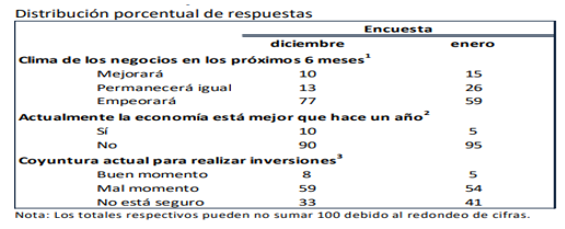 Por un lado, en cuanto al Clima de los negocios en los próximos 6 meses”, se observa una mejoría en la percepción que se deriva de las respuestas; en cuanto a la pregunta si “actualmente la economía está mejor que hace un año”, las respuestas negativas se incrementaron ligeramente y respecto a la pregunta sobre “Coyuntura actual para realizar inversiones”, se observa una disminución en la percepción positiva ya que las respuestas se orientan más a “no está seguro” como producto inequívoco de la incertidumbre que se vive hoy en día en cuanto a las inversiones.