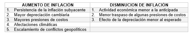 - El balance de riesgos todavía lo establece al alza, sin embargo, hace énfasis que la inflación subyacente sigue descendiendo y los efectos de la No Subyacente se disipen en los siguientes trimestres