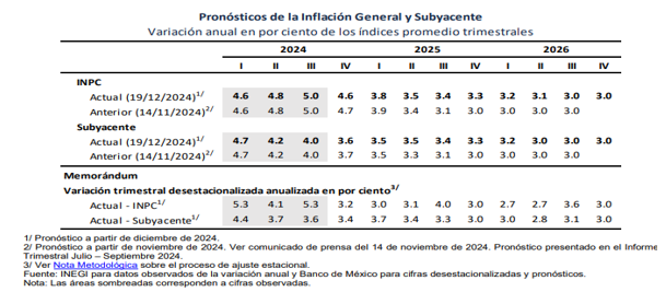 - Respecto a los pronósticos, en cuanto a la Inflación General bajaron para el 4º. Trimestre 2024 y 1º. Trimestre 2025, pero se incrementaron desde el 2º. Trimestre 2025 al 2º. Trimestre 2026