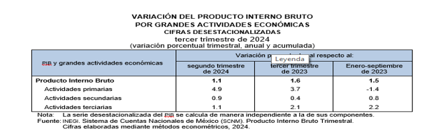 La más reciente contiene cifra al Tercer Trimestre de 2024 (Julio – septiembre), el cual fue publicado el 22 de noviembre 2024, donde se reporta un aumento trimestral de 1.1% en términos reales, con respecto al trimestre inmediato anterior e incremento anual de 1.6%.