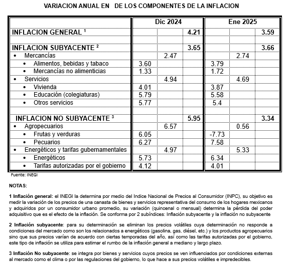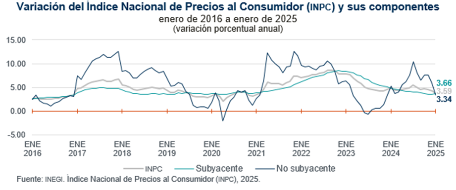 El Instituto Nacional de Estadística y Geografía (INEGI) informó que la variación anual de la inflación general1 para el mes de enero 2025 es de 3.59%, en cuanto a sus componentes: la inflación subyacente2 quedó en su cálculo anual en 3.66% y en cuanto a la inflación No subyacente3 su variación anual fue 3.34%.