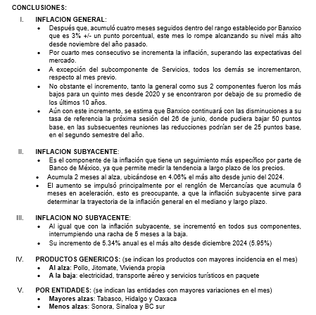 El Instituto Nacional de Estadística y Geografía (INEGI) informó que la variación anual de la inflación general1 anual para el mes de mayo 2025 es de 4.42%, en cuanto a sus componentes: la inflación subyacente2 en 4.06% y la inflación No subyacente3 su variación fue 5.34%.