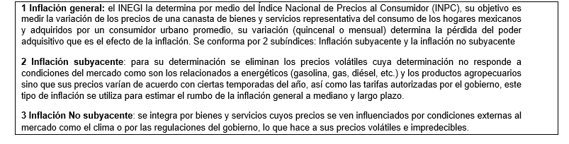 Por su parte, la inflación subyacente2 quedó en su cálculo anual en 3.91% y en cuanto a la inflación No subyacente3 su variación anual en fue 6.50%